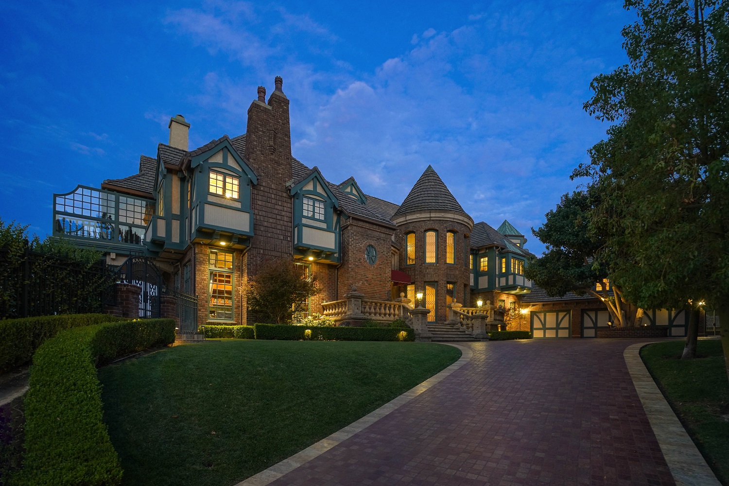 Welcome to 19000 Dorlon Drive, an exquisite property in Tarzana with breathtaking views above the Braemar Country Club. This gated estate, designed by Ronald Firestone, spans 8,700 square feet and sits on over 4 acres of picturesque land. The spacious step-down living room showcases a reclaimed stone fireplace, high vaulted ceilings, and French doors that fill the space with natural light. The formal dining room, with coffered oak ceilings, can easily accommodate 20 guests and overlooks the adjacent elegantly designed living room. The gourmet kitchen is a chef's dream, equipped with a La Cornue stove, a large center island, two oversized sinks, beamed ceilings, custom wood cabinetry, and multiple walk-in and butler's pantries. The highlight of the home is the massive 2-story great room with cathedral-beamed ceilings, French doors, an oversized stone fireplace, a wine cellar with imported pavers, and a full English pub bar. Additionally, there is an all-oak library with a marble fireplace, built-in bookshelves, a gentleman's bar, and French windows. The property features 5 bedrooms, including a luxurious primary suite. The private owner's retreat comprises a sitting room, a kitchen, a private balcony, a fireplace, a spacious en-suite bathroom with a spa tub and steam shower, and a large walk-in closet. Outside, you will discover a remarkable outdoor oasis spread across 4 acres. The meticulously landscaped gardens, large pool, outdoor pavilion with a kitchen and bath, and lighted tennis court create a resort-like setting. The panoramic views of the surrounding hills and the adjacent golf course greens are the true highlights of this property.