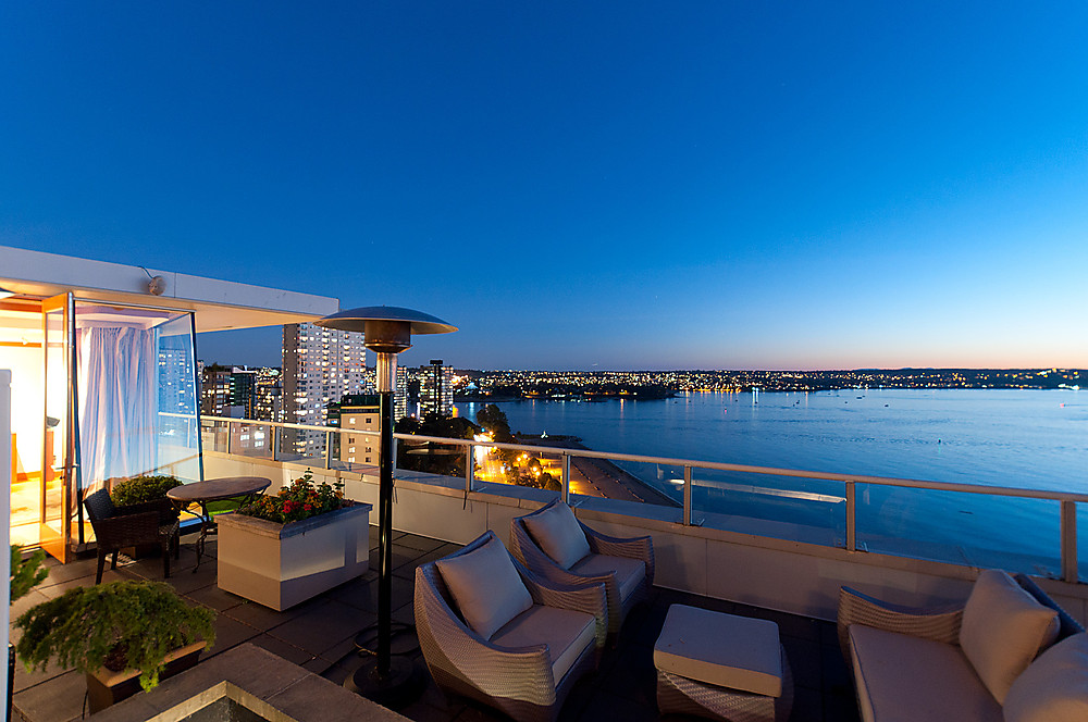 One of Vancouver's finest penthouses. Top floor unit with over 5,000 sq ft including 2,500 sq ft living space and 2,800 sq ft of outdoor space. Outdoor area includes kitchen area with fireplace and fire pit plus a totally private hot tub area. This residence is directly across from the summer fireworks display in English Bay. The sun never stops. The inside is modelled after an expensive yacht. This is the best penthouse downtown has to offer.